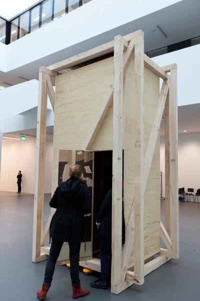 Outside is like a international transportation box, just delivered...rough beames, plywood.